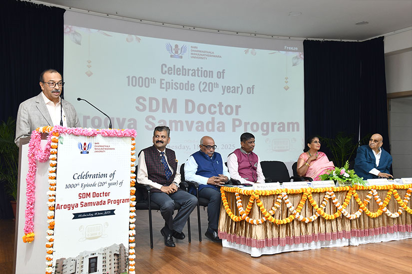 SDM Medical College, SDM University Celebrated the historical successive the 1000th Episode of SDM Doctor Arogya Samvada on 17th June and 18th June 2025. This program is been running every Tuesday between 7.00 to 7.30 pm for the last 20 years at Akashvani Dharwad which is a live phone-in-program. SDM Arogya Samvada program was started on 4th April 2006 by Poojya Shri D. Veerendra Heggade in association with the Media Giant, Akashvani Dharwad. Since then, this program has never stopped even a single Tuesday, including during the Covid-19 pandemic. Every week Doctors from various specialties go to Akashvani and give the advices on various healthcare issues and satisfactorily answers the queries of general public which is most appreciated by one and all. SDM Arogya Samvada is first time in its kind which has been running for the long 20th year and celebrating 1000th episode in the history of All Stations of All India Radios in the country.